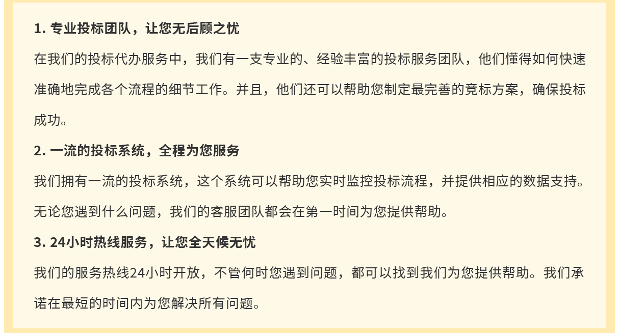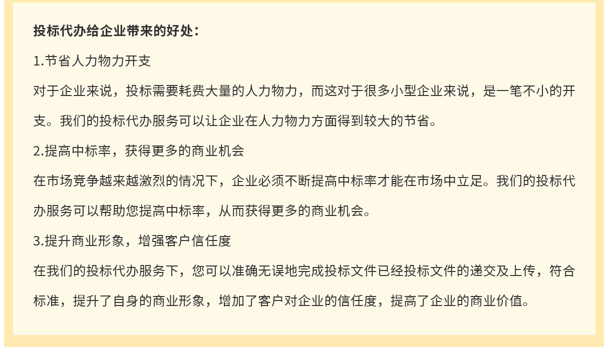 風險管理:我們將為您提供風險管理服務,包括對招投標過程中可能遇到的風險進行分析和評估,以及為您提供解決方案和風險控制建議。